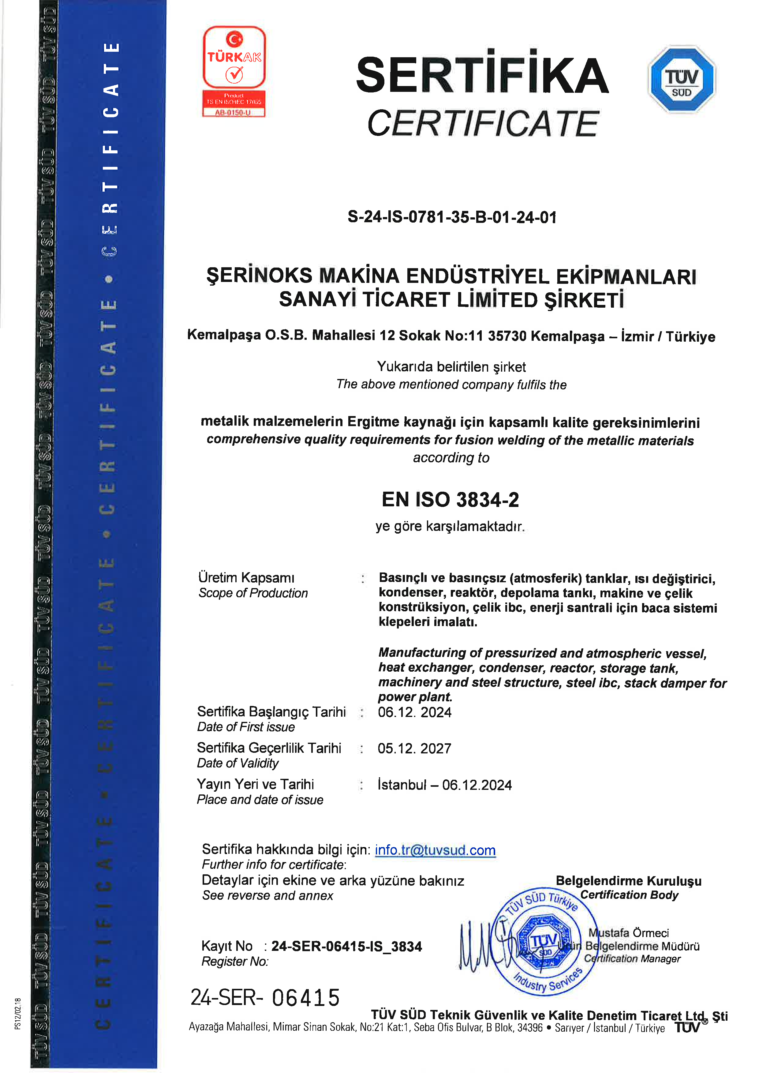 EKİM 2015 tarihi itibari ile TUV-SÜD/Türkiye tarafından EN ISO 3834-2 Belgesi almıştır.
