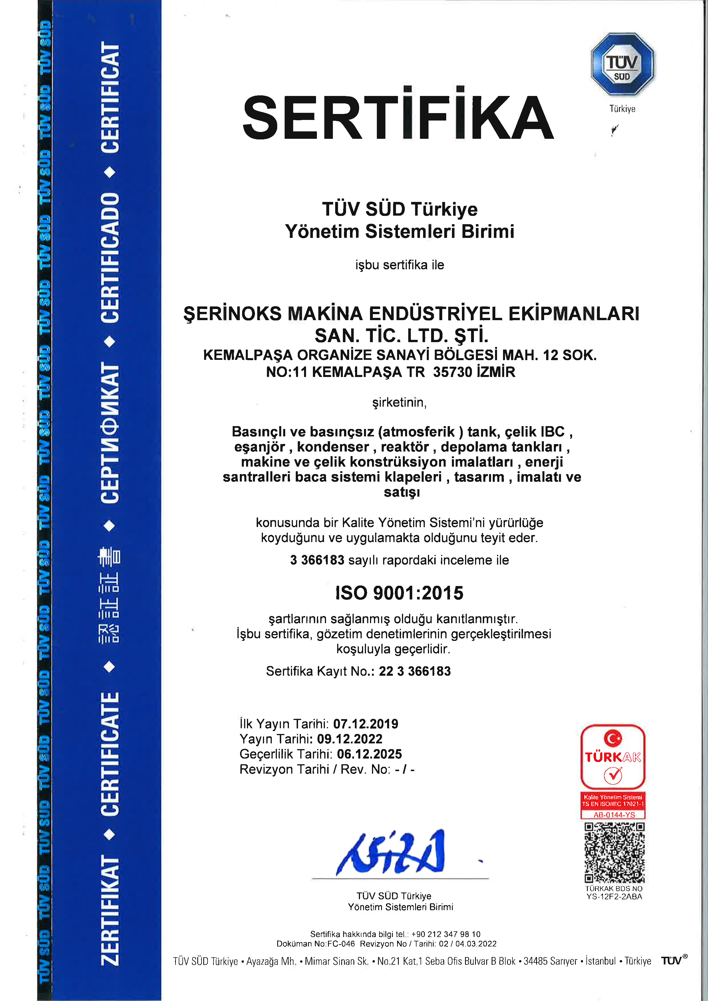 Şerinoks Makina Kalite Politikası gereği tüm malzemeler geçerli standartlara göre sertifikalı olarak kullanılmaktadır. Kaynak personeli belirlenen Yöntemlere göre Yeterlilik sertifikası sahibi personeldir. Yeterlilik sertifikaları Akredite olmuş bağımsız kontrol kuruluşları olan TUV SÜD, TUV Rheinland, 3D-IncertA tarafından onaylanmıştır.